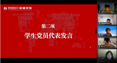 学生党员代表相继发言。19级研究生贺哲祺表示,“作为一名青年党员,我们要更严格的要求自己,做勇挑时代重担的弄潮儿”;17级本科生石中玉通过分享习近平总书记在其家乡河北正定的工作经历,呼吁学生党员“梦想从学习开始,事业从实践起步”;18级本科生史明鑫分享了他对红船精神的理解,他认为“红船精神”是我们走好新时代航程的海上灯塔。我们要将红船精神转化成为推动创新创业的强大动力,坚持用创新发展的理念规划自己的人生目标,让个人的青春梦想与中国梦交相辉映。