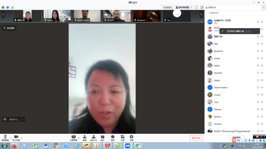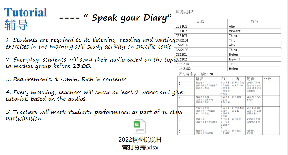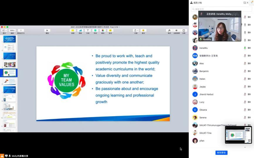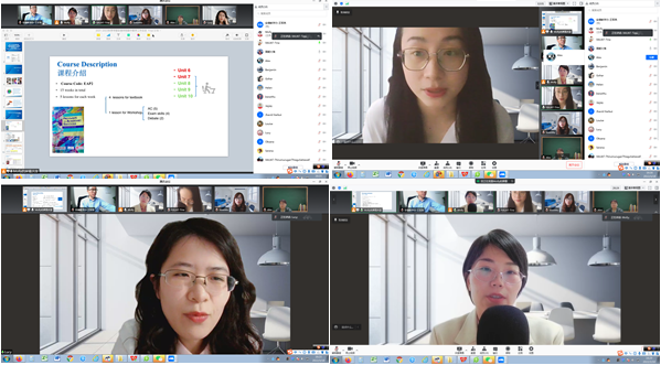 随后,学术英语教学组各位负责老师分别介绍了大一、大二及研究生学术英语教学安排。Tina老师对大一年级的课程安排、教学大纲、评价体系、上课准则、一对一辅导安排等方面作了介绍。针对线上课程实行精细化过程管理,最大程度地调动学生的积极性,并且对辅导会的形式进行改革,由Speak Your Diary替代写笔记,强化巩固学生的口语交际能力。Lucy老师介绍了大二年级的相应内容,强调对学生独立学习能力以及学术研究写作能力的培养,明确了辅导会要求:固定辅导时间,与外教面对面口语对话,制定个性化学习方案,因材施教。Molly老师针对研究生教学目标和安排做了介绍,提升整体学生的学术词汇、学术写作、口语、听力和阅读等五个方面的能力,以提升论文的写作和增强口语交际能力为重点。