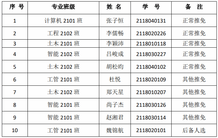 根据成人论坛 《关于推荐2025年优秀应届本科毕业生免试攻读研究生的通知》(西建大[2024]51号)、《成人论坛 关于推荐2025年优秀应届本科毕业生免试攻读硕士研究生实施方案》等文件精神和要求,通过学生本人申请、教学办及学工办共同核查学生申报资料、学生答辩,经成人论坛 推免工作小组会议评审,学院党政联席会通过,拟推荐以下10名同学为成人论坛 2024年免试研究生(其中后备1人),现予以公示: