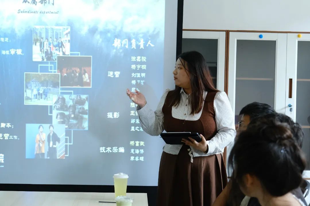座谈会第三项,校团委网编副主任黄樱涵详细介绍推文的投稿形式,强调稿件内容的重要性和时效性。紧接着,校团委微信部部长石怡洋分享了会议类视频的剪辑技巧,会议全体成员受益匪浅。